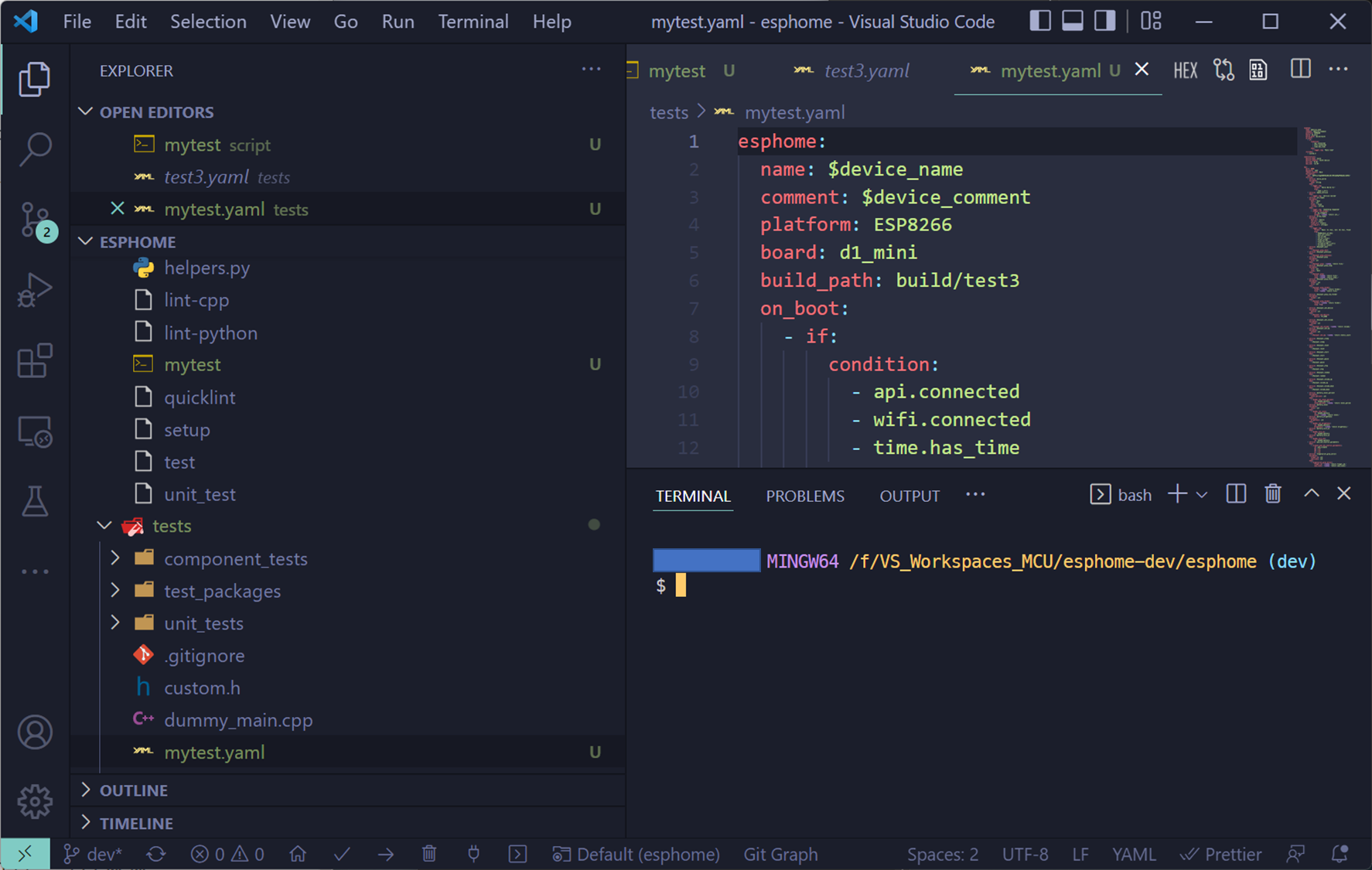 'script'는 개발을 편하게 해주는 각종 자동화 스크립트가 들어있는 폴더입니다. 앞에서 개발환경을 설치하는 데 사용한 'setup'스크립트도 여기에 들어있죠. esphome 컴파일 테스트를 할 때 필요한 스크립트는 바로 'test'입니다. 내용 보시면 별건 없습니다. 'esphome complie'이라는 명령어로 'test#.yaml'이라는 또 다른 스크립트를 차례대로 실행하라고 되어 있네요.