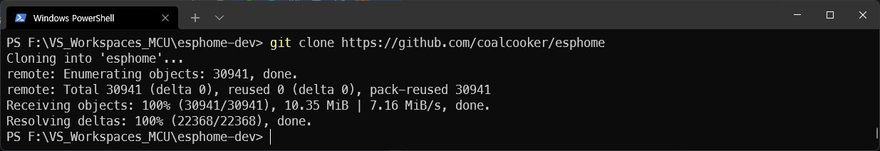 이제 컴퓨터에서 개발환경을 설치할 폴더를 하나 만듭니다. 저는 이름을 "esphome-dev"라고 했습니다. 그리고 여기에다가 포킹 한 나의 ESPHome 저장소를 복제합니다.