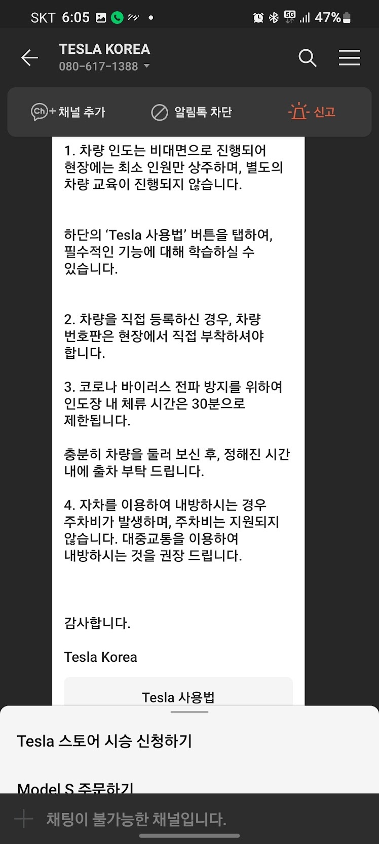 그리고 인도 예정을 알리는 카톡이 왔습니다. 광명에 있는 딜리버리 센터의 주차장으로 가면 된다네요. 차량 인도는 비대면으로 진행되고 사용법에 대한 안내 등 지원이 전혀 없으니 알아서 하라는 내용입니다. 음... 차량에 하자가 있으면 어쩌냐고 제 물주께서 궁금해하는데.. 설마 그런 일은 없겠죠. 테슬라의 태도가 건방지지만 어쩔 수 없습니다.