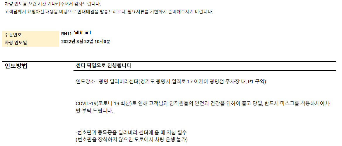 2022년 8월 19일 (D-3) - 차량등록 & 인도 예정 카톡