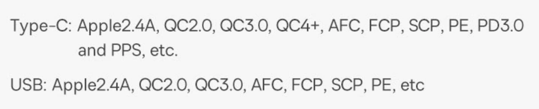 충전 스펙도 살펴보겠습니다. 지원하는 충전 규격은 다음과 같습니다. 웬만한 고속 충전 규격에 C타입은 PD3.0까지 지원해서 특별히 신경 쓸 필요 없이 충전 잘 되겠구나라고 생각할 수 있습니다. 단독 충전 시 C타입은 최대 100W, A타입은 최대 60W까지의 속도를 지원합니다.