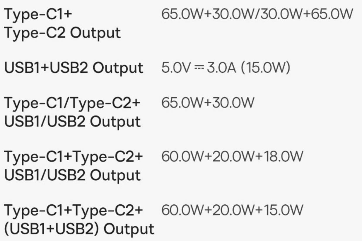 1개 포트만 사용할 때보다 약간 떨어지긴 했지만 여기서 약 7W가량 속도가 부족해 보이는 듯한 이유는 제품 스펙을 보면 알 수 있습니다. 아래 표는 제품 설명 페이지에서 가져온 건데요. 충전 포트를 조합해서 사용할 때 지원하는 최대 충전 속도를 보여주고 있습니다. 첫 번째 C타입 포트 2개를 동시 사용할 경우에 나와 있듯 최대 충전 속도는 65 + 30 = 95W입니다. 그러니 앞에서 확인한 63.6/65W, 27.1/30W의 속도는 스펙에 충실한 속도라는 걸 알 수 있죠.