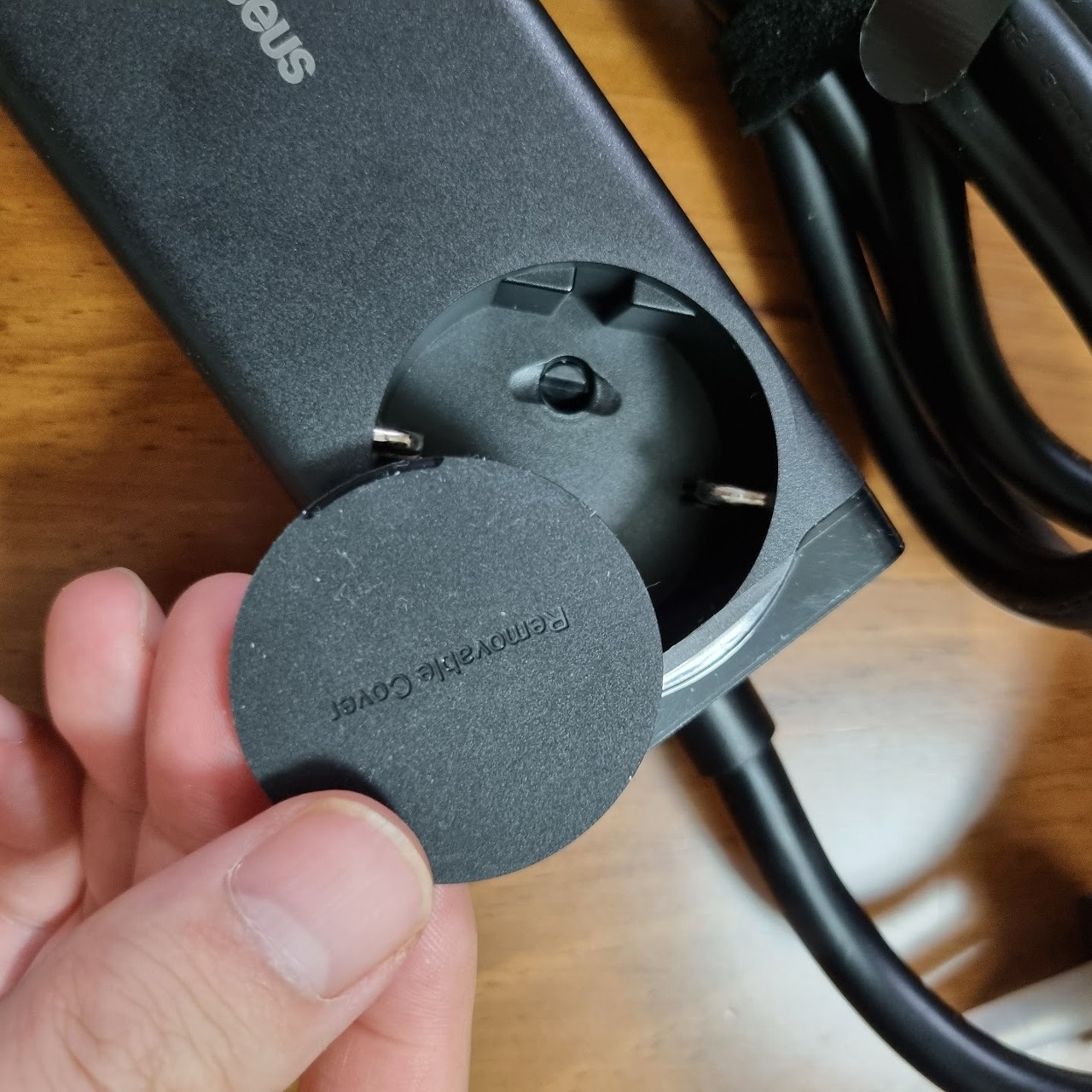 그냥 지나칠 수 있는 부분들인데, 220V AC 콘센트 부분에 실리콘 재질의 덮개가 덮여있고 플러그의 금속 단자도 손상 방지용 커버가 씌워져 있습니다. 아마 사용을 시작하면 버리고 없어질 것들이지만 하나라도 더 신경을 쓴 일정 수준 이상의 제품이라는 느낌을 받을 수 있었습니다. 그리고 선정리용 찍찍이 테이프는 Baseus의 트레이드마크 같은 거죠.