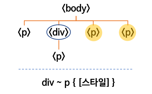 같은 레벨에 있는 요소 선택 | div ~ p { color: red; } | 선택자를 "~"로 연결 |