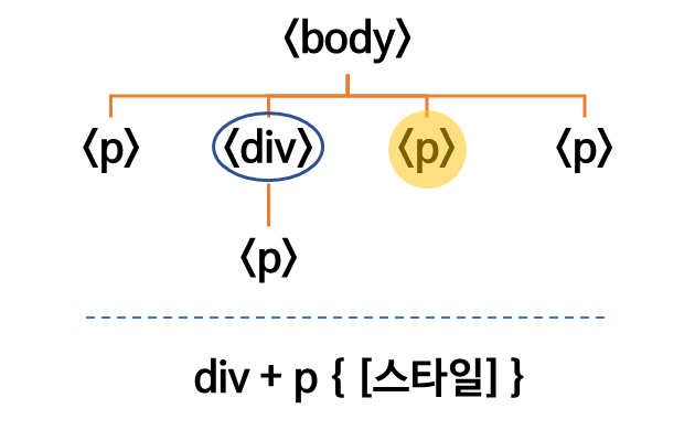 같은 레벨에서 바로 다음 요소만 선택 | div + p { color: red; } | 선택자를 "+"로 연결 |