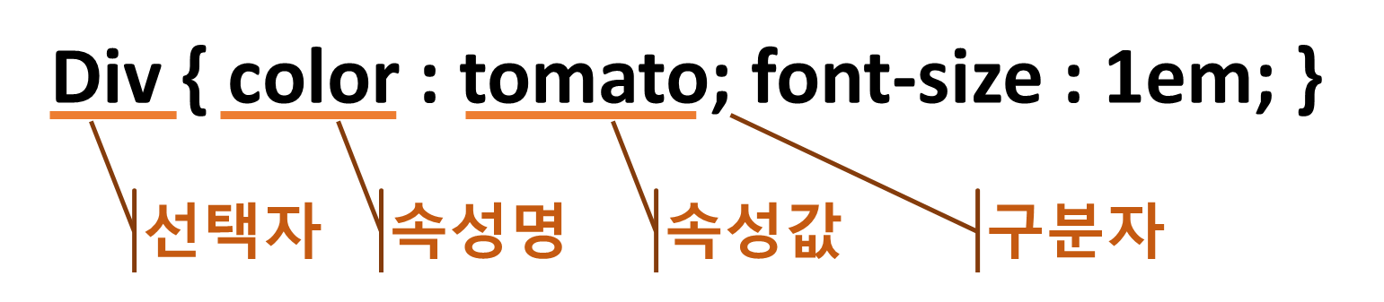 CSS는 선택자와 선언부로 구성되는데 스타일을 지정할 목적물을 가리키는 '선택자'가 먼저 나오고 중괄호({}) 안에 적용할 스타일을 나열하는데 이를 '선언부'라고 합니다. 속성과 속성의 구분 혹은 선언은 마지막에는 세미콜론(;)을 사용합니다.