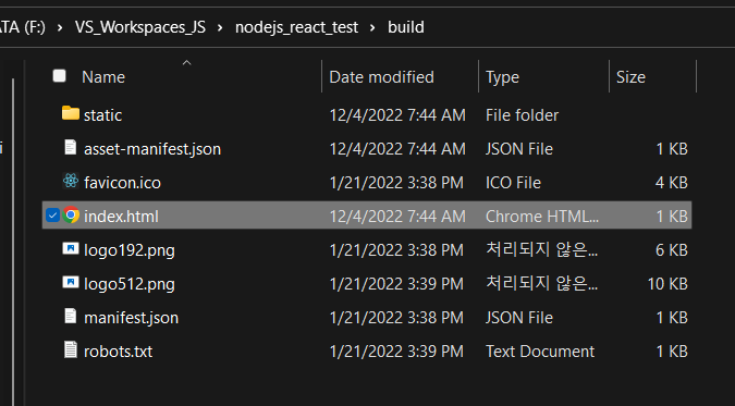 그런데 이상하게도 빌드 폴더에 있는 여러 파일들이 여기서는 보이지 않고 index.html 파일 하나만 볼 수 있습니다. 당연히 index파일은 화면에 표시할만한 내용은 하나도 없기 때문에 빈 화면만 보이는 거였습니다. 그럼 index파일에 언급되어 있는 저 파일들은 다 어디 가고 표시가 되지 않는 걸까요?