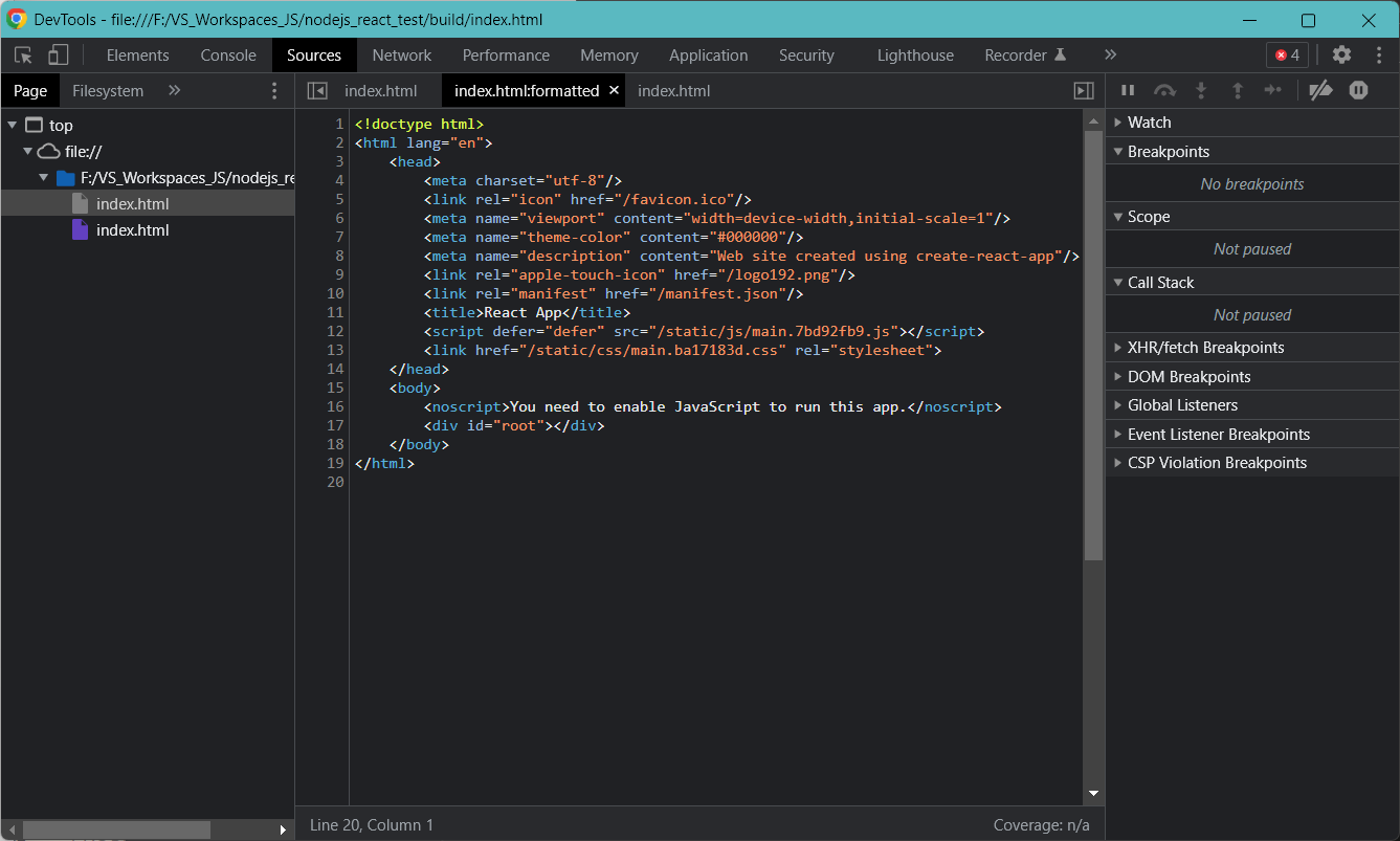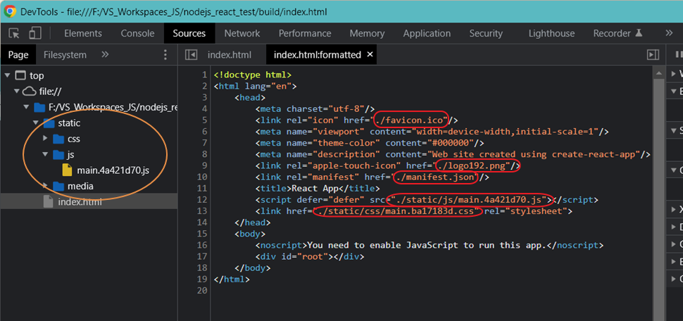 개발도구를 열어보면 다음과 같이 정상적으로 필요한 모든 파일을 인식하고 있는 걸 볼 수 있고 index파일도 아까와는 달리 경로 부분이 바뀌어 있습니다.