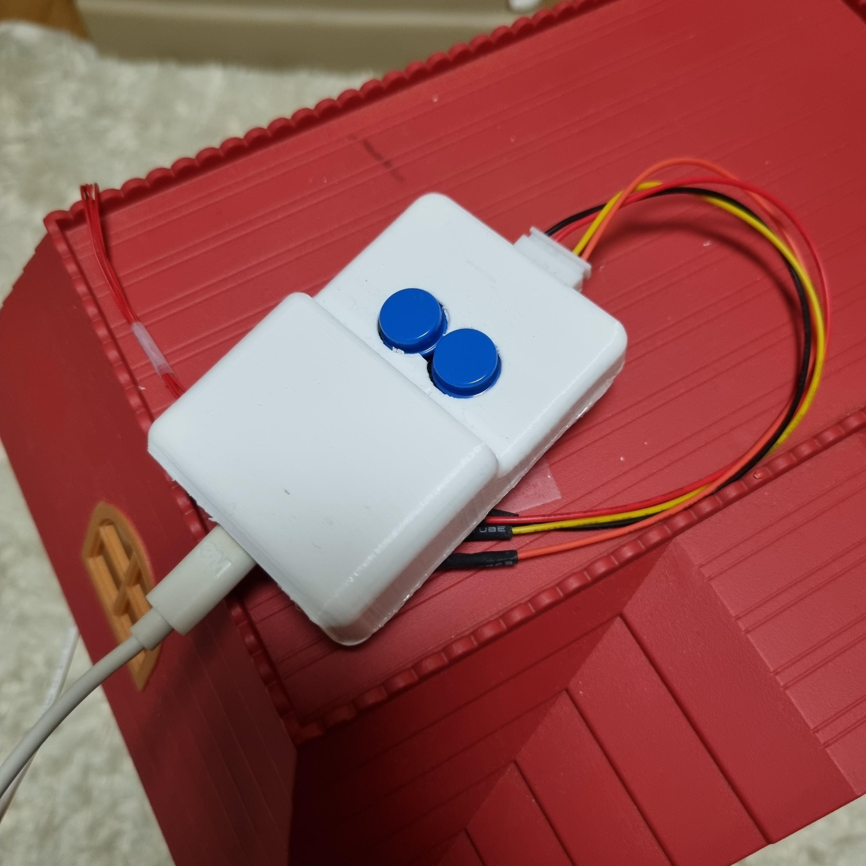 아기가 만져야 하니까 기판은 최대한 숨기도록 케이스를 하나 만들어서 1층, 3층 불 켜고 끌 수 있는 스위치를 각각 달았습니다. 한번 누르면 켜지고 또 누르면 꺼지는 방식입니다.