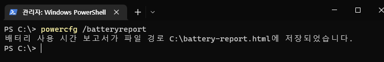 먼저 윈도 OS를 사용하는 노트북에 해당하는 방법입니다. 터미널 열고 아래 명령어 입력하면 배터리의 상태와 최근 충/방전 기록을 확인할 수 있는 배터리 보고서를 만들어 줍니다.