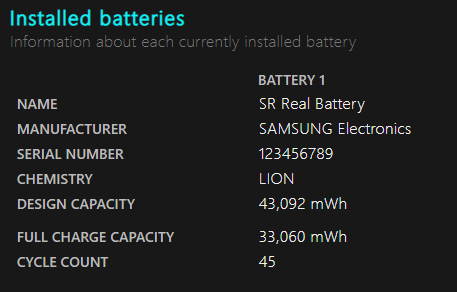 요건 2년 이상 사용한 노트북 배터리입니다. 설계 용량대비 약 77% 수준으로 가용 용량이 많이 떨어져 있네요. 처음 1년 동안은 아무 생각 없이 사용했기 때문에 100% 완충 상태가 상당히 오래 지속되었고 후반 1년은 80%로 충전 제한기능을 사용했었습니다. 업무용으로 사용하는 노트북이고 대부분 전원에 연결된 상태로 사용되었기 때문에 Cycle count는 숫자가 높지 않은 것 같습니다. (시리얼 번호는 아무거나 대충 넣은 걸까요?!)