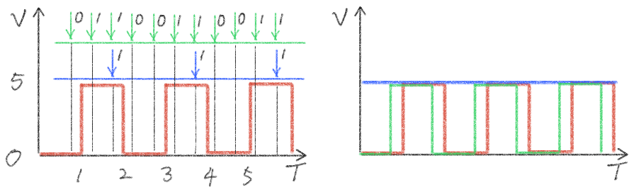 예를 들어 A에서 "10101"이라는 데이터를 B로 보낸다고 생각을 해보겠습니다. 송신자는 스위치를 껐다가 켜는 동작으로 0과 1을 만들어냅니다. 발생되는 데이터를 시간에 따른 전압의 변화로 그려보면 송신되는 원본 데이터는 왼쪽 차트의 빨간색 그래프와 같습니다. 이때 송신자는 1초 간격으로 5초간 켜고 끄는 동작을 반복했습니다. 그러나 만약 수신 측에서 2초에 한 번씩 전압을 확인한다면 어떨까요? 같은 차트에 전압을 측정하는 시점을 표시해 보면 파란색 화살표와 같겠죠. 처음에는 5V 전압을 인식하고 다음 전압 확인 시간인 2초 후에도 똑같이 5V를 인식합니다. 소스 전압은 이미 한번 꺼졌다 켜지는 동작이 있었지만 수신자는 알 방법이 없고 여전히 켜져 있는 걸로 인식할 수밖에 없습니다. 반대로 2초가 아니라 0.5초에 한 번씩 더 자주 확인한다면 어떨까요? 이경우 실제로 보낸 데이터는 "10101"이지만 수신된 데이터는 "1100110011"로 원래 데이터가 외곡이 됩니다.