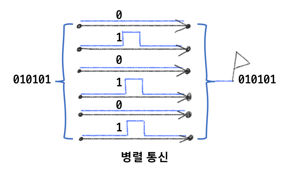 시리얼(Serial) 통신이라는 건 전달해야 할 데이터를 직렬로 전달하는 방법을 지칭하는데요. 직렬이라는 건 데이터를 순서대로 차례차례 주고받는 방식을 의미합니다. 직렬이라는 용어가 있다는 건 병렬도 있다는 건데 병렬은 여러 개의 채널을 이용해서 데이터를 한꺼번에 보내는 방식을 의미합니다. 아래 그림을 보면 그 차이가 어떤 건지 바로 감이 오겠죠.