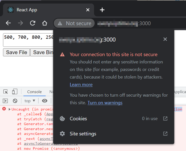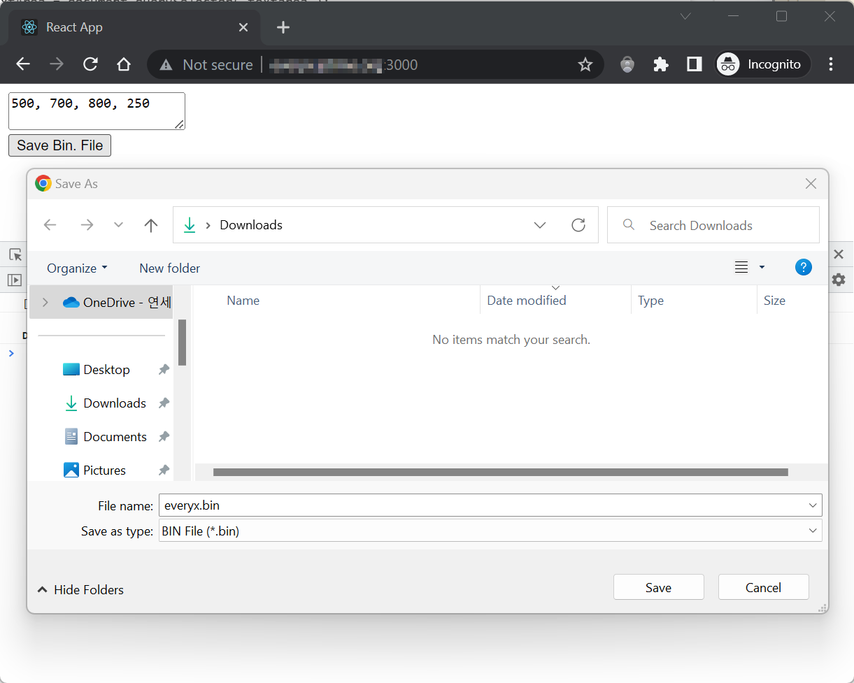 8~12행, 그리고 21행이 기존 API를 대신하는 꼼수입니다. 파일시스템 API를 사용하는 대신 보이지 않는 <a> 태그를 추가하고(21행) 파일 저장 버튼을 누르면 JS에서 이 링크가 마치 파일을 다운로드하는 링크인 것처럼 만들고 클릭까지 해서 파일 다운로드 창이 뜨도록 만드는 코드입니다. 결과는 아래와 같이 보안연결이 되지 않은 상태에서도 파일 저장이 가능해집니다.