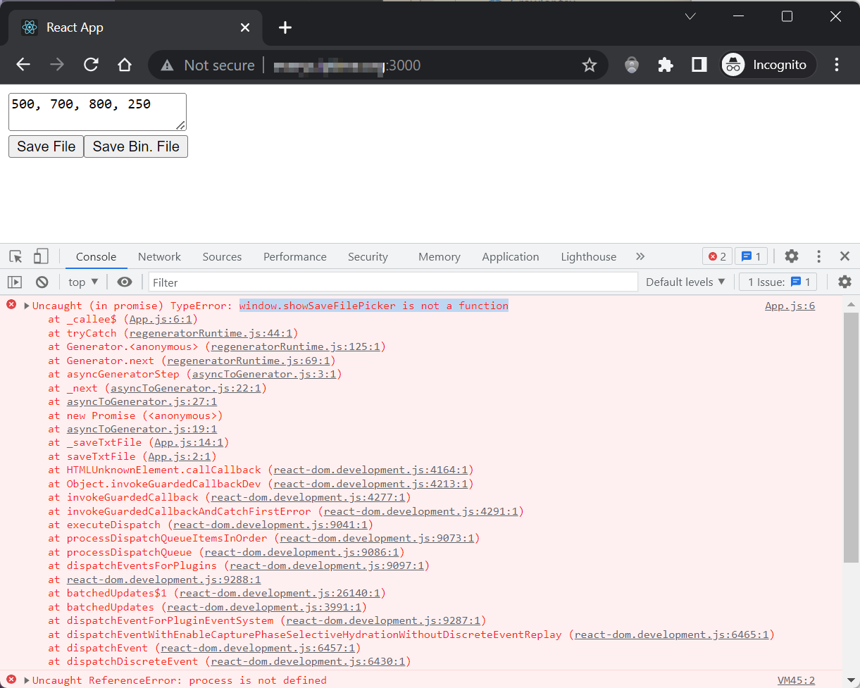 여기서 사용한 윈도 파일시스템 API는 사용하시는 개발 환경에 따라 사용이 제한될 수 있습니다. 위에 있는 코드를 그대로 복사했는데, 'Save File'버튼을 눌러도 아무런 반응이 없어?! 하시는 분이 계실 수도 있습니다. 이럴 때는 브라우저의 개발자도구 열어서 콘솔창을 확인해 보시면 아래와 같이 에러가 찍혀있습니다. 내용을 보면 첫 줄에 "window.showSaveFilePicker is not a function"이라는 메시지가 있네요.