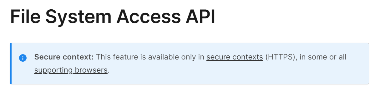 파일 시스템을 다루는 API를 브라우저에서 지원하더라도 사용하는 웹이 보안접속이 되지 않으면 관련 API를 차단합니다. MDN web 문서를 보시면 첫 줄에 HTTPS에서만 사용가능함이 명시되어 있습니다.