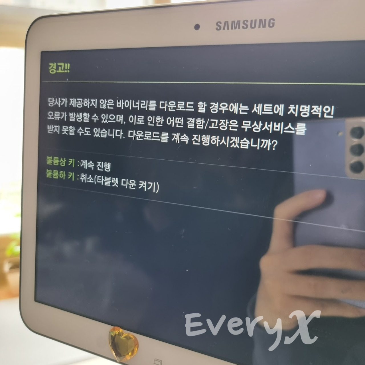 이제 TWRP를 설치합니다. 탭 기기의 전원을 껐다가 앞에서 한 것처럼 다운로드모드로 다시 켜줍니다.