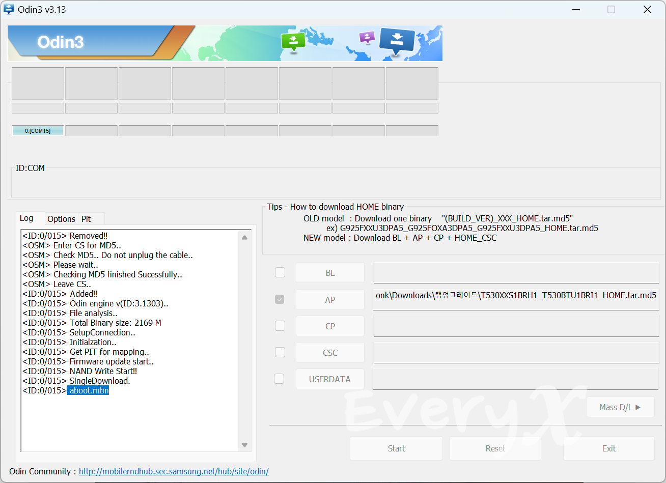 이제 5핀 케이블은 찾기도 힘드네요. 서랍 깊숙한 곳에 숨겨진 아이템들 다 꺼내서 제일 튼튼해 보이는 놈으로 갈아 끼고 했더니 잘 됩니다. 아, 이렇게 멈췄을 때는 오딘은 그냥 X 눌러서 끄고 탭은 전원버튼 길게 눌러서 종료한 다음 다시 다운로드 모드로 들어가면 됩니다.
