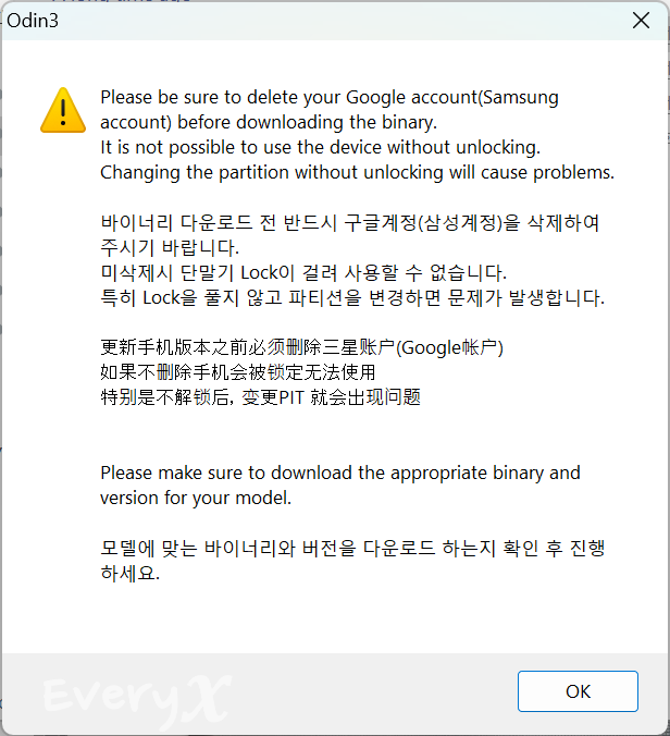 오딘을 실행하면 이런 경고 메시지가 뜹니다. 기기에 연결된 계정을 먼저 삭제하라고 하네요. 겁나니까 그냥 기기 공초하고 시작해야겠습니다.