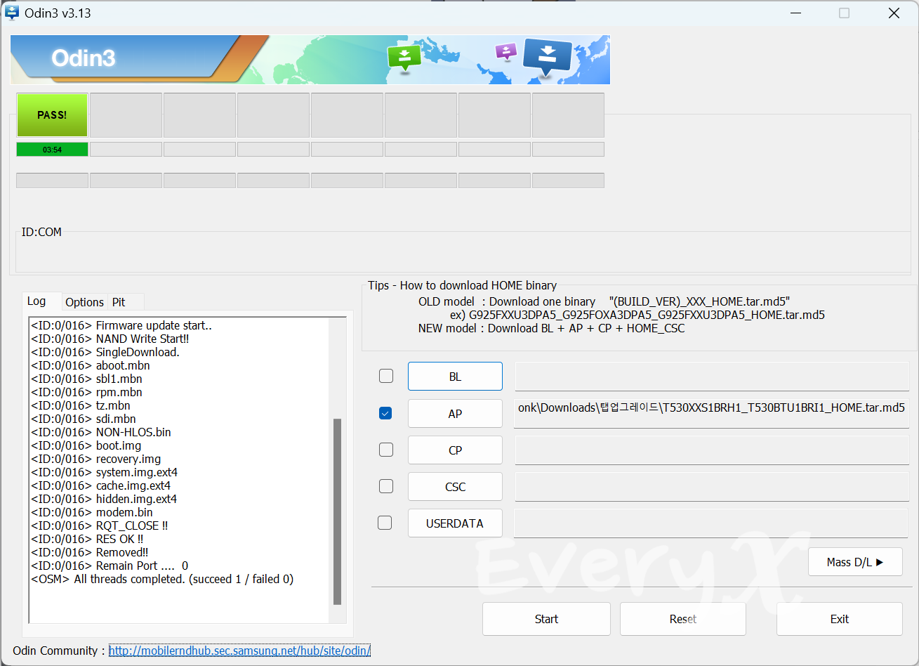 펌웨어 업그레이드가 끝나면 오딘은 위 화면과 같이 되고, 탭은 저절로 리부팅을 합니다.