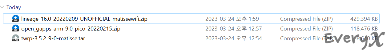 Oldbuild라고 된 폴더 안에 가장 최신 날짜인 "lineage-16.0-20220209-UNOFFICIAL-matissewifi.zip" 파일로 다운로드하였습니다. 그리고 그 아래 인기파일 리스트 중에 twrp 압축파일도 있는데 그것도 하나 다운로드하였습니다.
