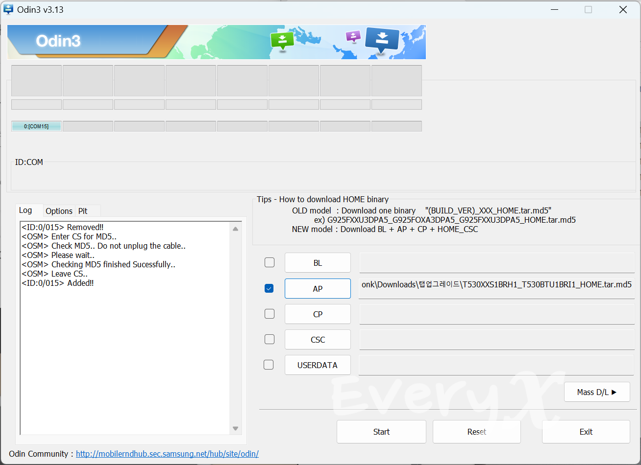 PC에서 실행 중인 오딘 화면을 보면 로그창이 Added!!!라는 메시지를 확인할 수 있습니다. 그럼 준비가 된 거예요. 아래 화면처럼 모두 준비가 되었다면 이제 "Start"버튼을 누릅니다.