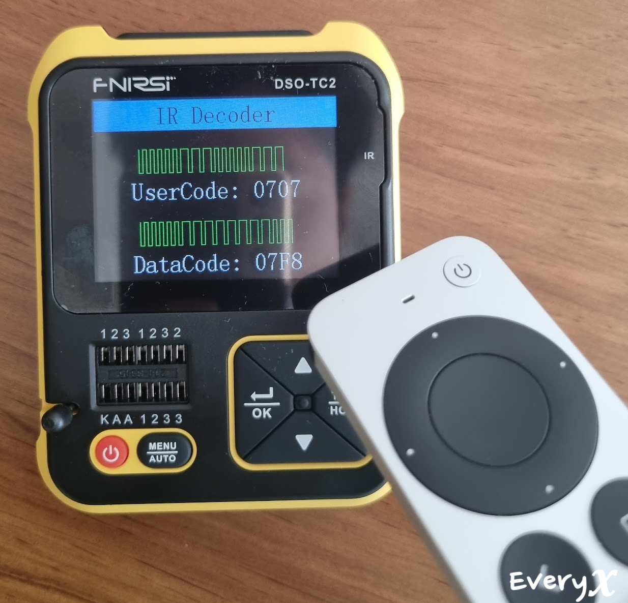 테스트 모드에서 한 가지 숨겨진 기능이 더 있습니다. 적외선 리모컨의 신호를 디코딩하는 기능인데요. 제품 전면에 IR이라고 표시된 부분을 향해 리모컨 신호 쏘면 그 결과가 화면에 표시됩니다. 간단히 리모컨 신호를 복사하거나 IR신호 확인할 때 사용할 수 있을 것 같습니다.