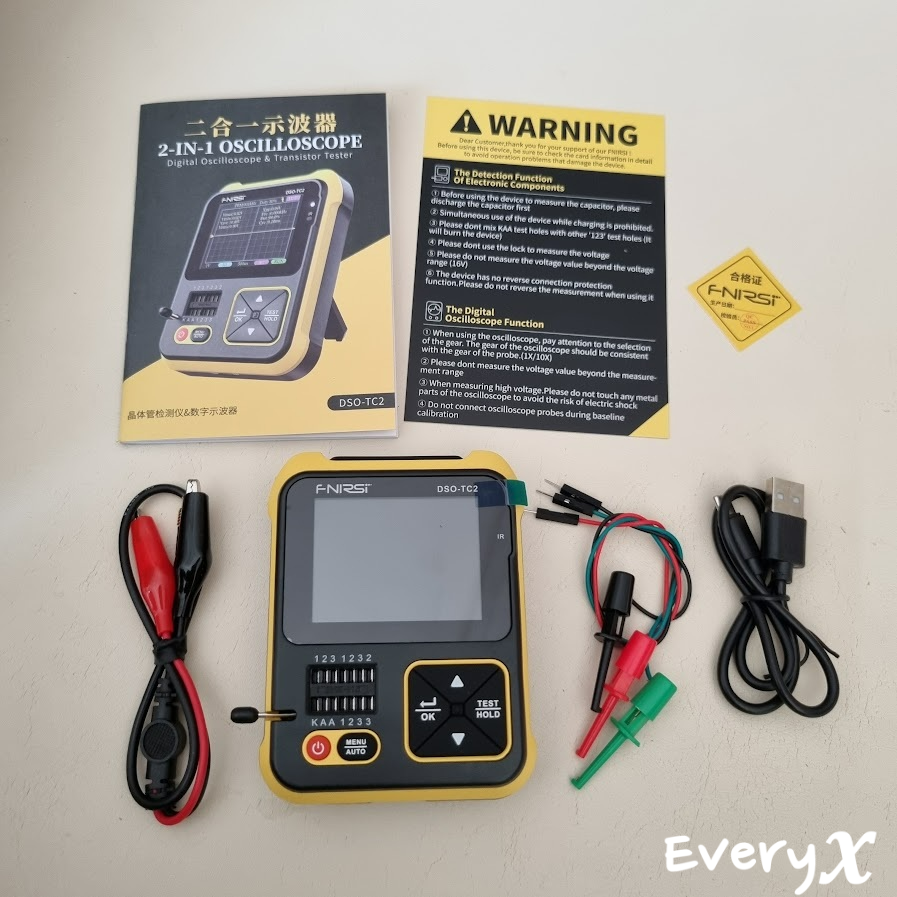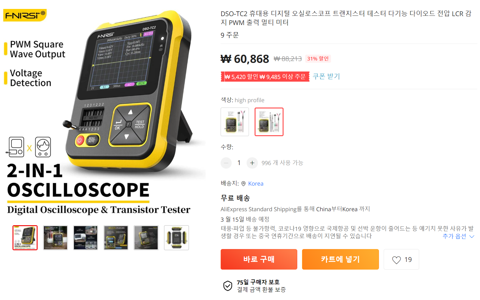 그렇게 이 없이 잇몸으로만 버텨오다가 눈에 쏙 들어오는 제품을 발견했습니다. 일단 디자인 이쁘고, 오실로스코프 기능도 적당한 데다가 추가적으로 여러 가지 테스터로도 같이 쓸 수 있는 2 in 1 제품인데 가격도 괜찮아 보였습니다. 바로 FNIRSI사의 DSO-TC2라는 제품이고, 알리에서 5~6만 원대에 구매가 가능합니다.