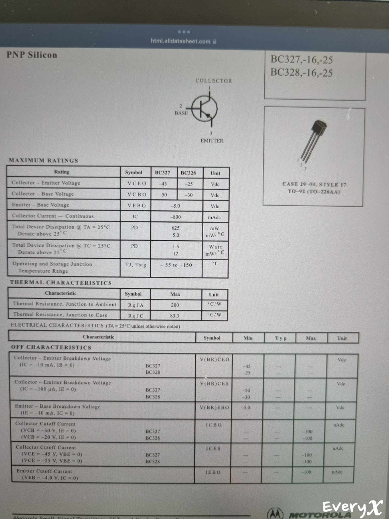 그리고 가장 신기한 게 트랜지스터의 극성을 파악해 주는 기능인데 아래 사진처럼 PNP 트랜지스터 테스트하고 데이터시트와 비교를 해 봤는데요. 다른 건 잘 모르겠지만 일단 PNP타입이란 거 정확하게 구별하고 있고 어느 다리가 콜렉터, 베이스, 에미터인지 극성도 정확하게 파악하고 있는 걸 알 수 있습니다.