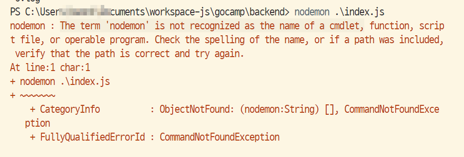 만약 nodemon을 실행하는데 아래와 같이 에러를 만나셨다면 nodemon이 설치되어 있지 않거나 글로벌로 설치되어 있지 않아서이니 참고하세요.