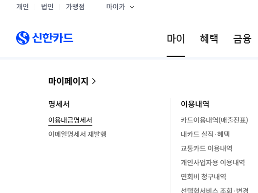 PC기준 신한카드 홈페이지에서 "마이 > 마이페이지 > 이용대금명세서" 메뉴로 이동합니다.