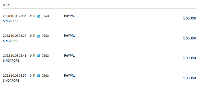 페이팔 접속해서 카드 연결을 했고 카드번호, 보안코드, 만료년월을 입력했습니다. 보통 이 정도 하면 카드 등록 다 되죠. 그런데 안되더군요. 전 왜 안 되는지도 모르고 내가 번호를 잘못 입력한 줄 알고 몇 번이나 재시도를 했습니다. 알고 봤더니 카드번호 보안코드 다 잘 입력했고, 승인 내역에 1달러씩 착착 올라가고 있었습니다.