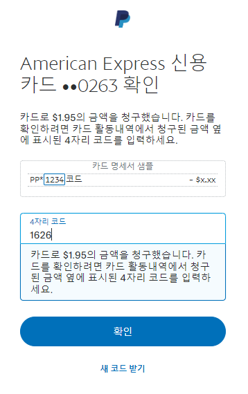 이 코드를 확인한 후 이제 페이팔로 다시 가서 이틀 전에 못한 카드 인증 페이지로 다시 가서 확인한 코드를 입력합니다.