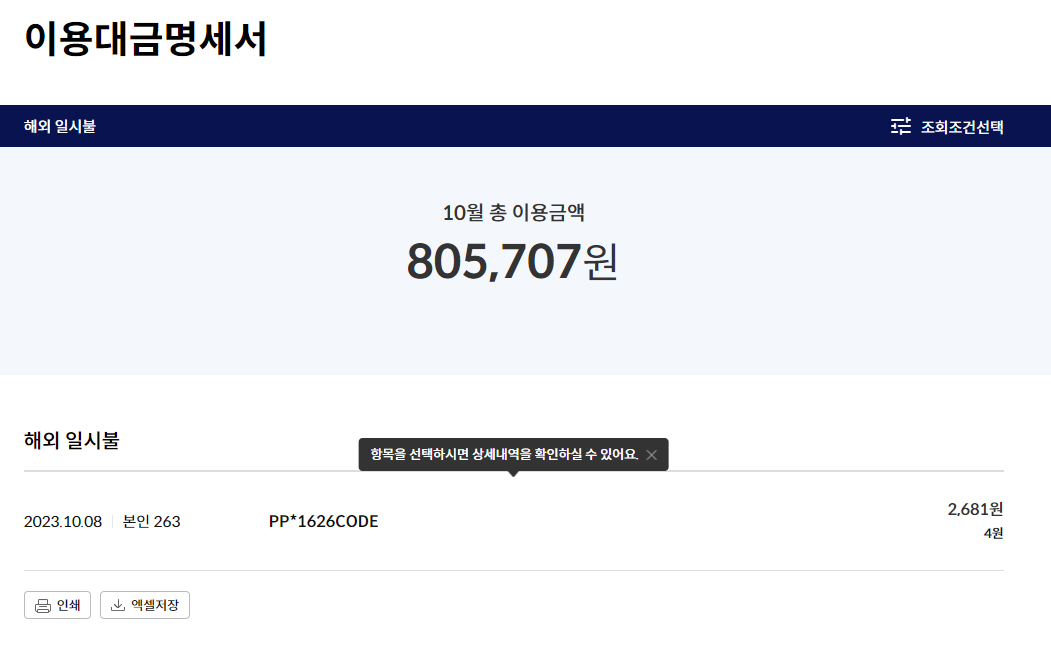 그럼 해외에서 사용한 카드명세서를 볼 수 있고 여기에서 PP*XXXXCODE라는 걸 확인할 수 있습니다.
