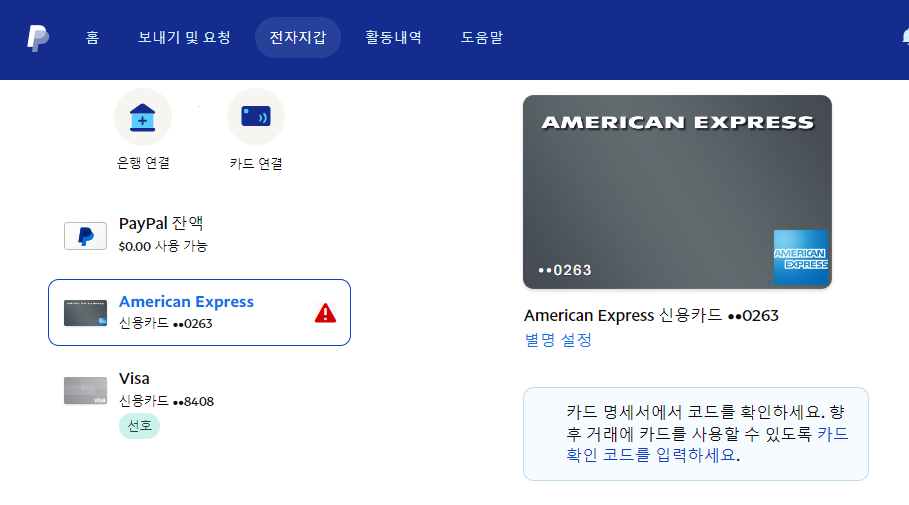 뭐지 싶어 PC로 페이팔 홈페이지 다시 들어가 봤더니 모바일에서는 안 보이던 게 보였습니다. 등록된 카드옆에 빨간 주의 아이콘이 있네요. 신한 아멕스 카드는 정상 등록을 해도 추가 인증을 하지 않으면 사용할 수 없는 상태가 됩니다.