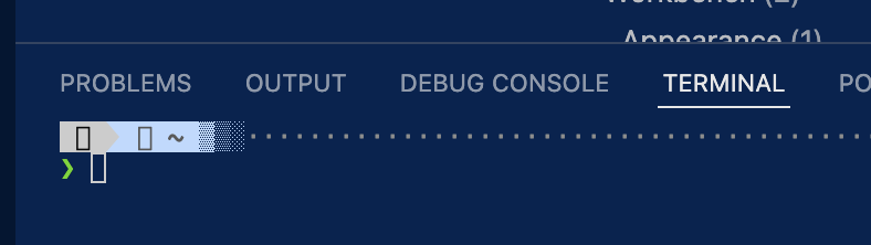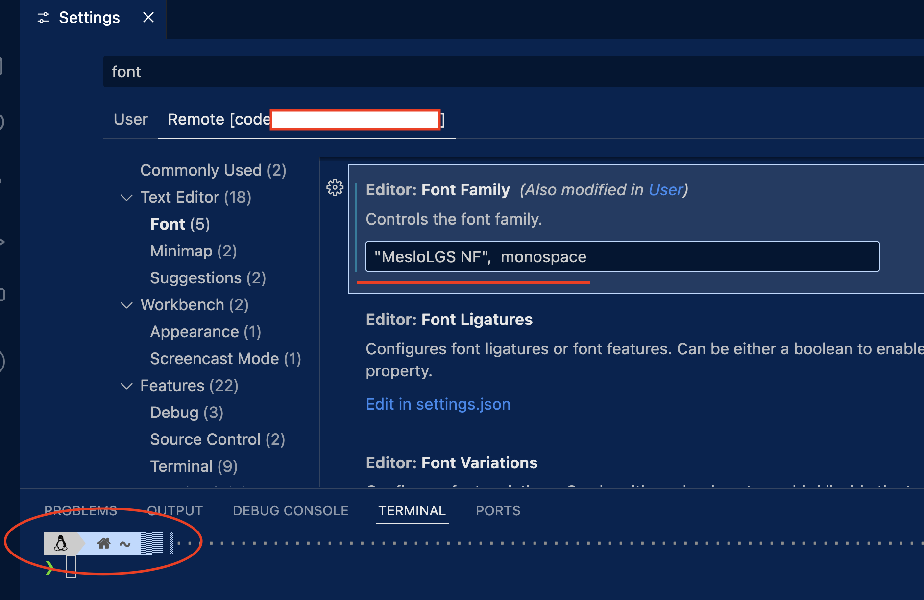 code-server의 설정창을 열고 Font 섹션에 다음과 같이 추가된 폰트의 이름을 넣어줍니다. 앞서 작성했던 font-family의 값을 넣어주면 되죠. 그럼 터미널창에 네모 네모로 깨져 나오던 부분에 귀여운 펭귄도 생기도 집모앙 아이콘도 생겼습니다. ^^