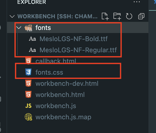 이제 준비된 폰트를 code-server에 올려야 하는데, 폰트 작업을 할 위치를 어디로 잡아야 할지 난감합니다. 인터넷 글들을 찾아보면 다양한 버전이 존재합니다. code-server 버전마다 다르고 그리고 설정하시는 분들 취향 따라 다른 것 같기도 하고, 아무튼 저는 서너 가지 방법 따라 해 봤는데 그중에서 2가지 방법으로 성공했고 그 2가지를 살짝 짬뽕해서 이렇게 정착했습니다.